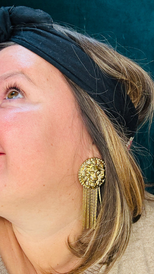 Boucle Félindra - tête de lion dorées pampilles dorées tombantes acier inoxydable