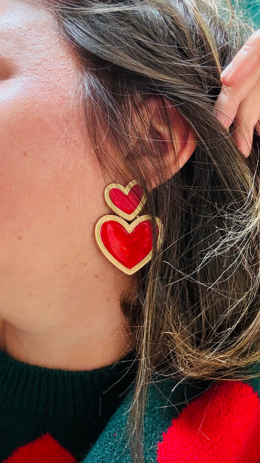 Boucles d'oreille aimée - double coeur rouge te doré acier inoxydable