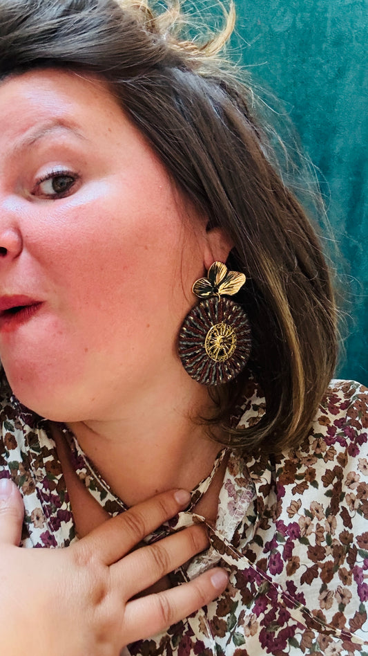 Boucle d'oreille Marika- grosse boucle fleur doré et cercle soleil et fils dorés