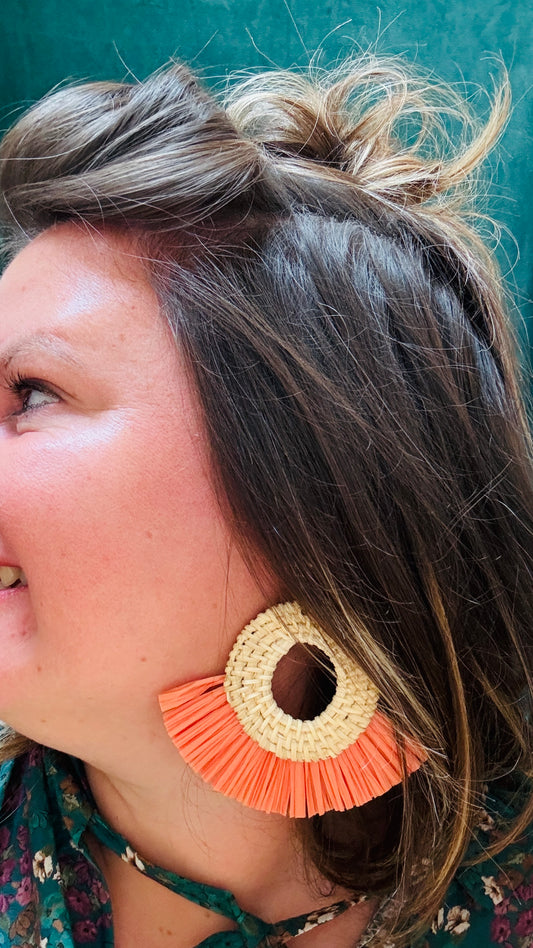 Boucle d'oreille Raphia - grosse boucle légère et colorée en orange corail ou vert d'eau