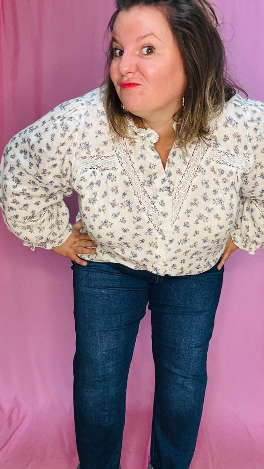 Blouse Berthe- grande taille manche longue liberty beige et bleu