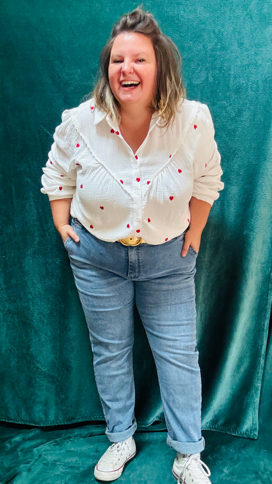 Blouse Valentine- grande taille manche longue gaze de coton blanche motifs coeurs rouges