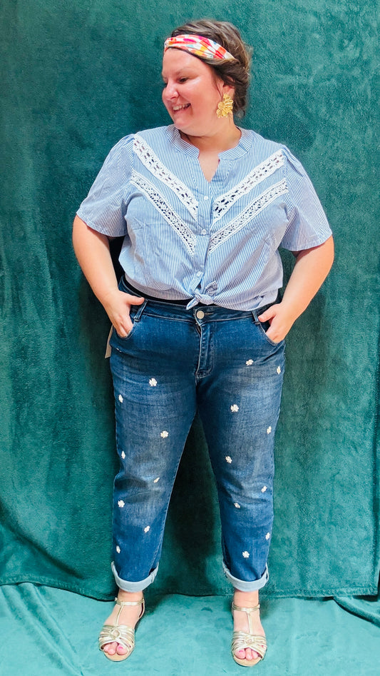 Chemise Capucine - grande taille rayées bleu marine te blanc détail dentelle