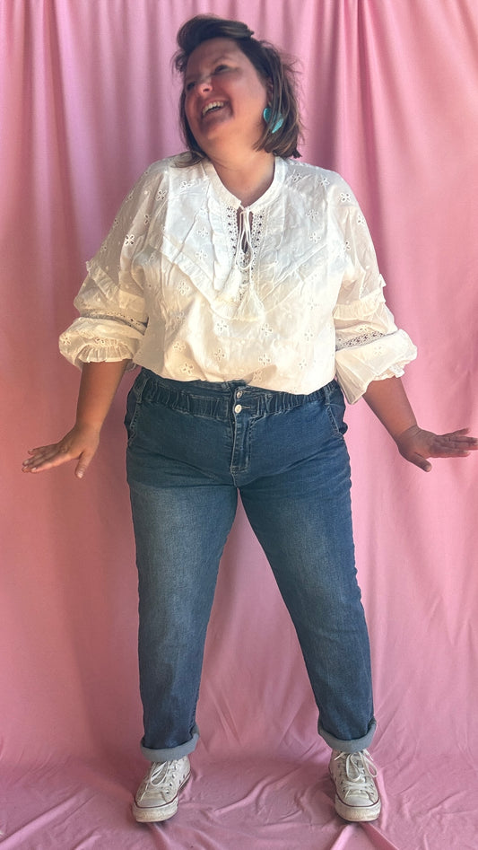 Blouse Angela - grande taille blanche manche longue détail froufrou et dentelle