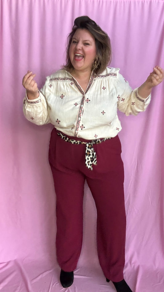Helene - Blouse chemise grande taille beige motifs brodés bordeaux manche longue