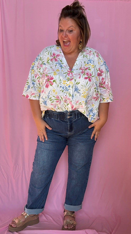 Blouse Gina - grande taille broderie blanche et détail coloré bleu rose et jaune