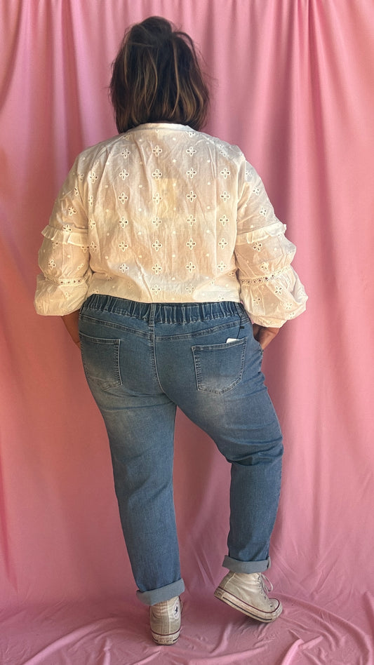 Blouse Angela - grande taille blanche manche longue détail froufrou et dentelle