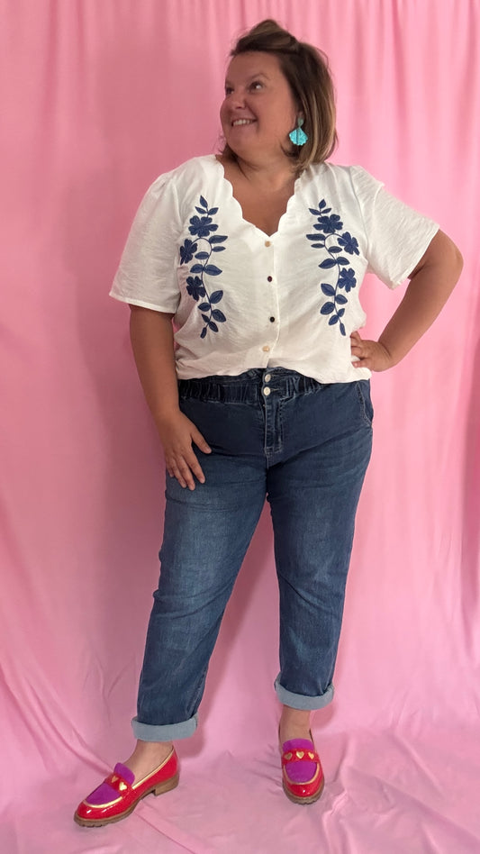 Top Luc - grande taille manche courte blanc broderies bleues