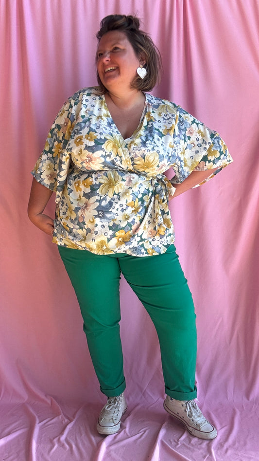 Top Basile - grande taille motif fleuris kaki ou bleu manche courte chauve souris