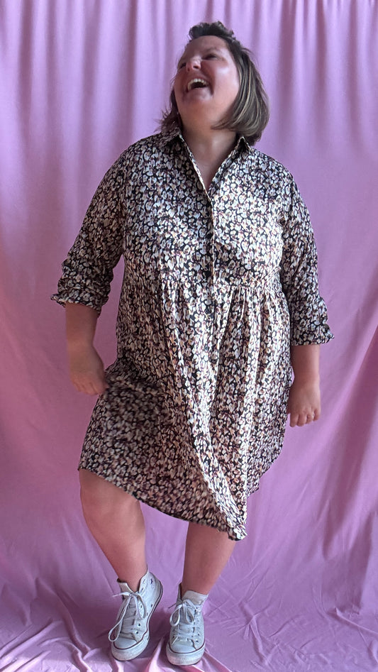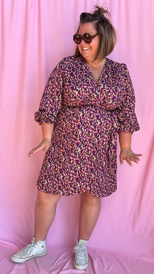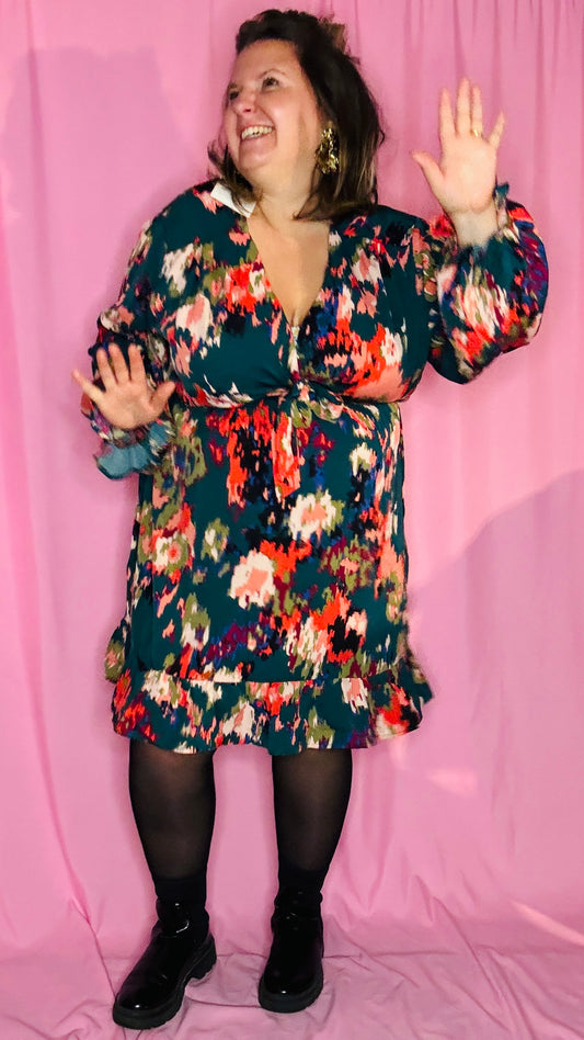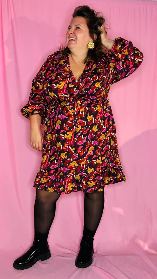 Robe Marie- grande taille manches longues motif fleuris très colorée cache coeur