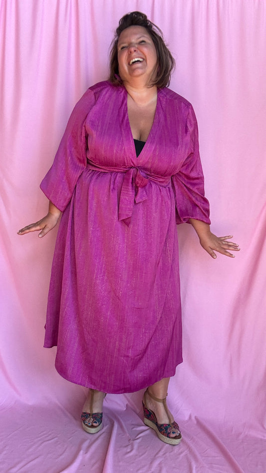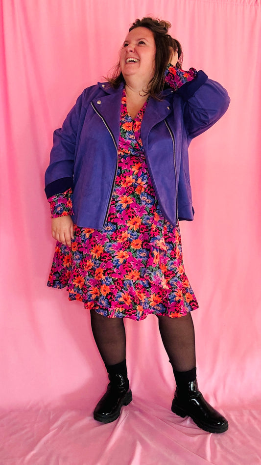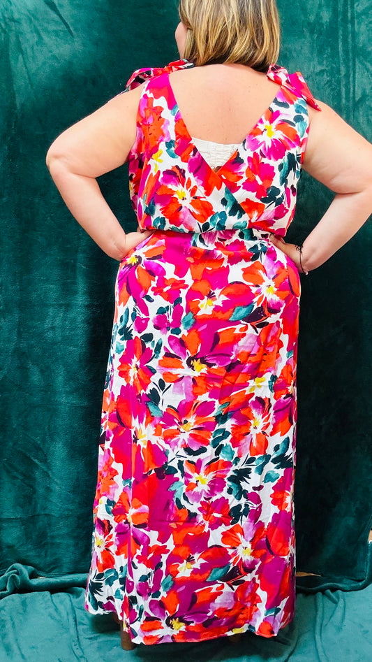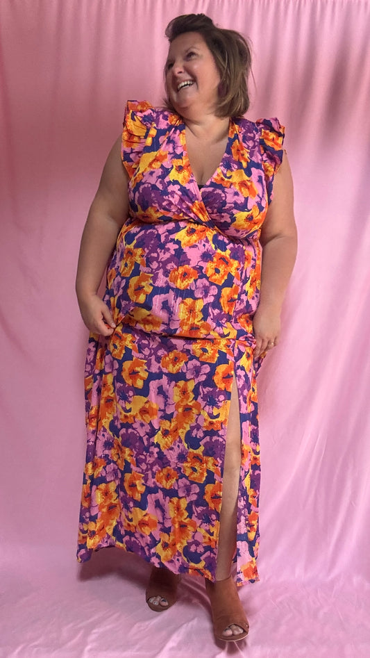 Robe Poussine - grande taille longue décolleté V et dos motifs fleuris violet rose orange
