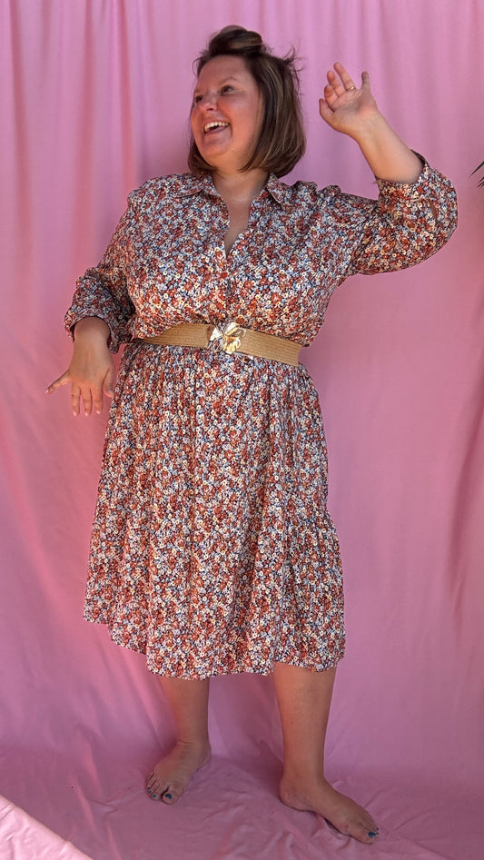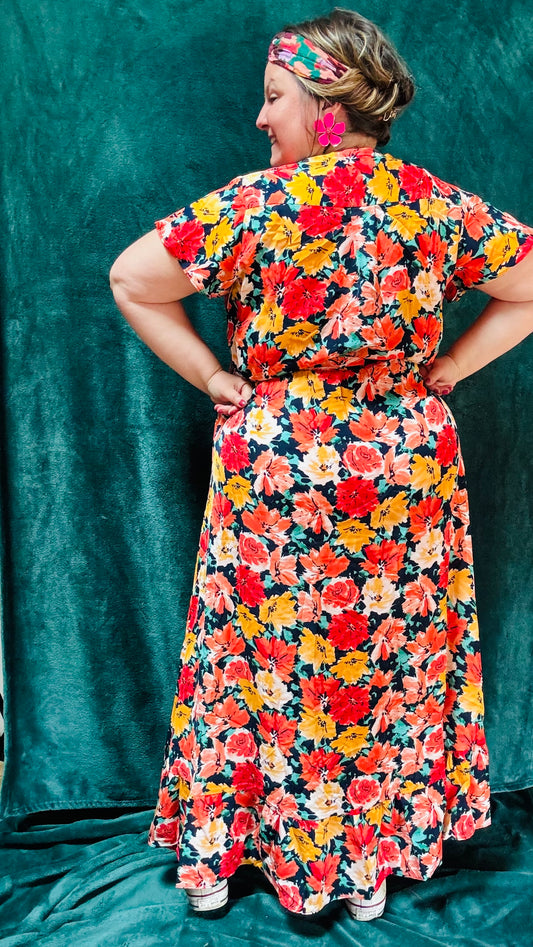 Robe longue Mathilda - grande taille à motifs fleuris aux couleurs chaudes
