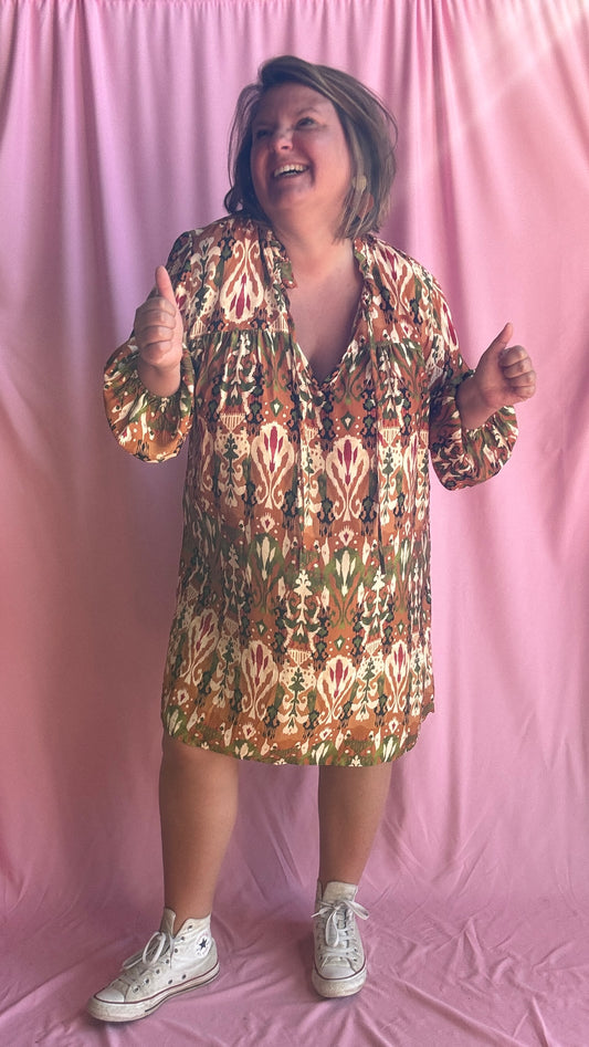 Robe Alberta - grande taille droite motifs ethnique kaki et orange