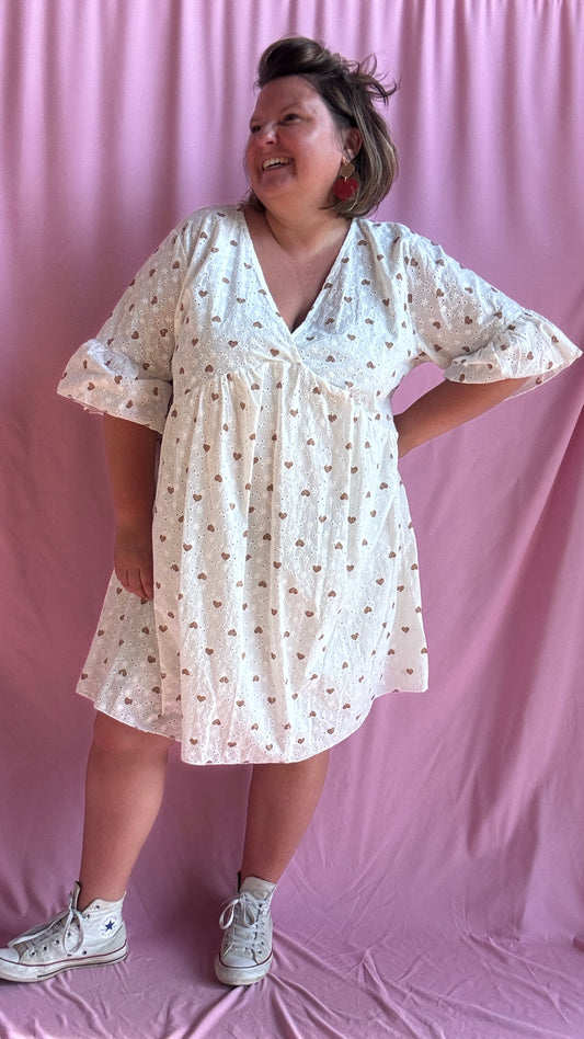 Robe Tina - grande taille coupe droite blanche motifs coeurs marron camel