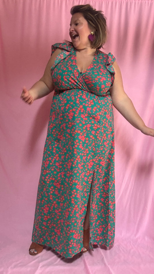 robe Nath - grande taille longue verte motif liberty rose orangé