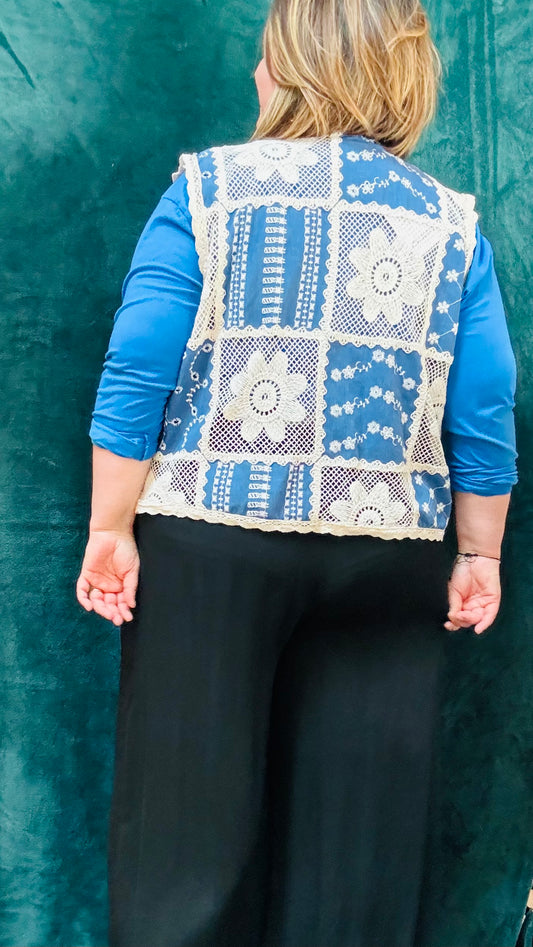 Veste sans manche Simone broderie et crochet bleu jean et crème