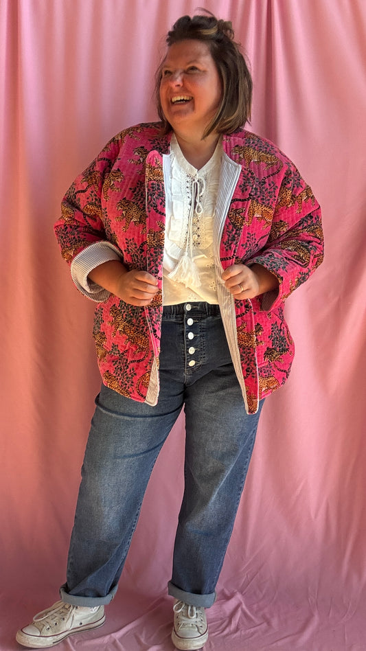 Veste Isadora - grande taille velour côtelée fuchsia motifs léopard ou grise